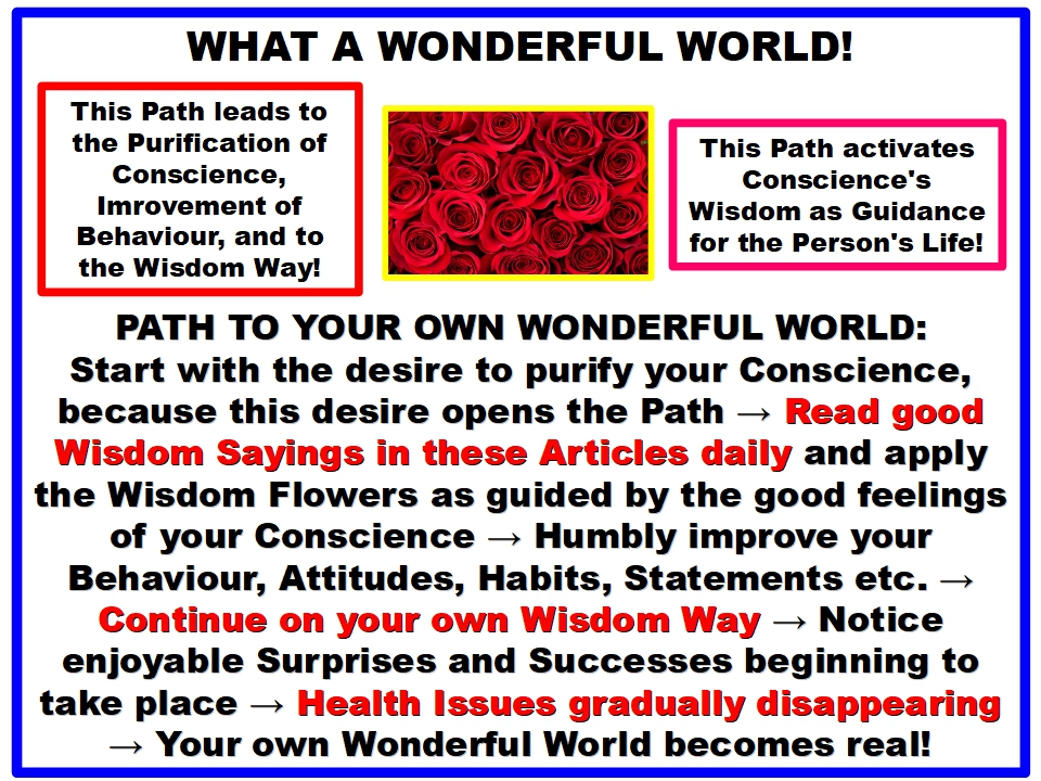 1 Start with the desire to purify your Conscience, because this desire opens the Path → 2 Read good Wisdom Sayings in these Articles daily and apply the Wisdom Flowers as guided by the good feelings of your Conscience → 3 Humbly improve your Behaviour, Attitudes, Habits, Statements etc. → 4 Continue on your own Wisdom Way → 5 Notice enjoyable Surprises and Successes beginning to take place → 6 Health Issues gradually disappearing → 7 Your own Wonderful World becomes real!